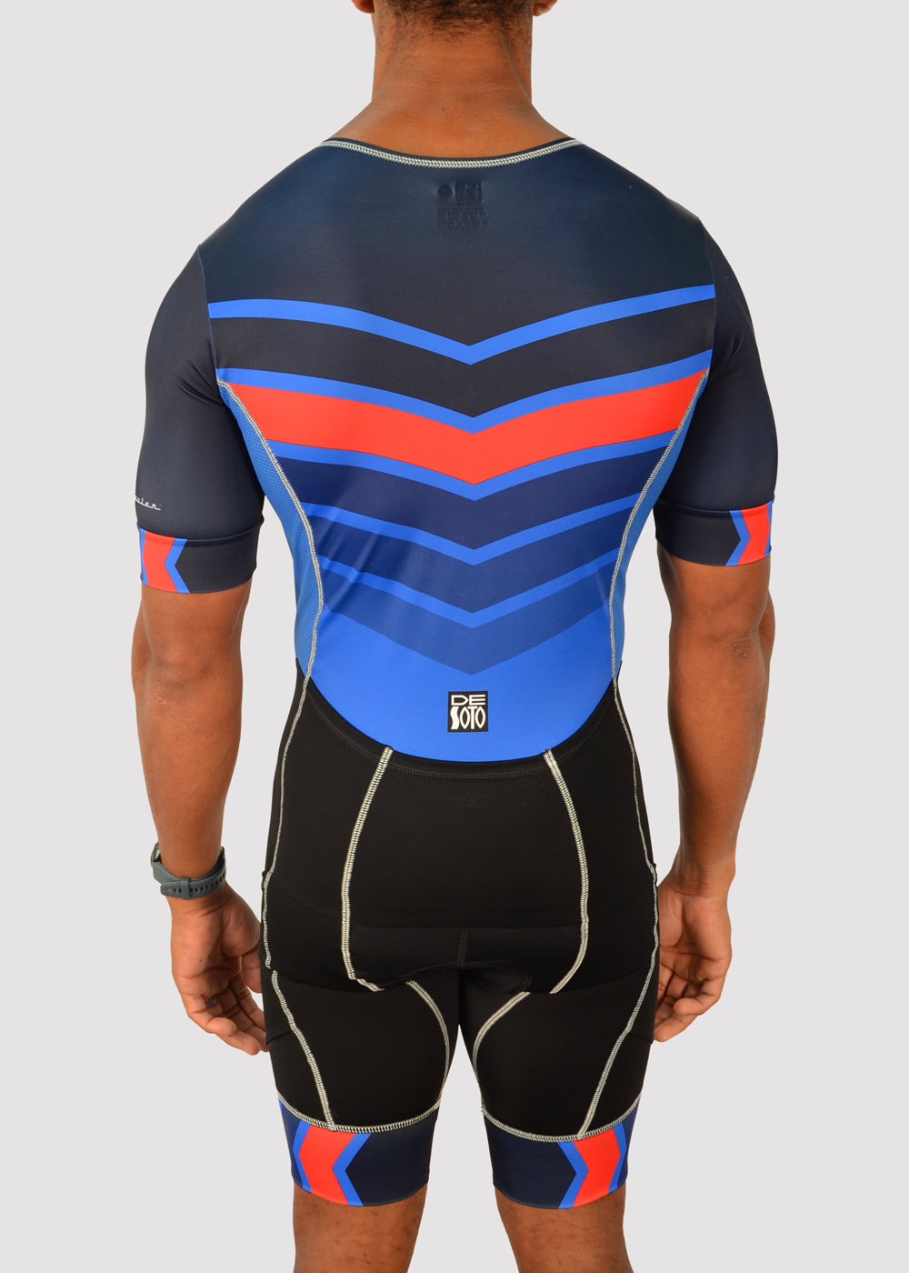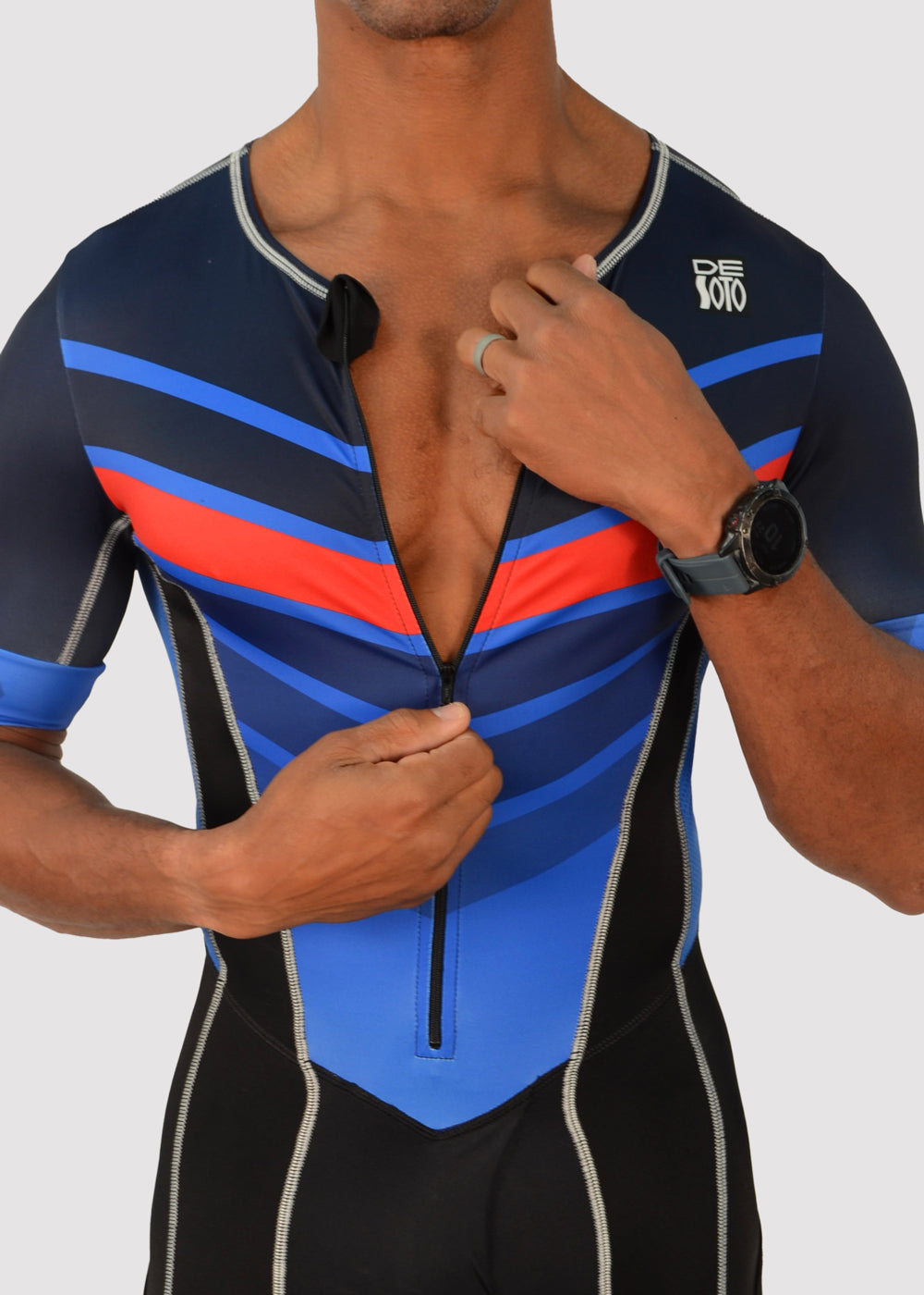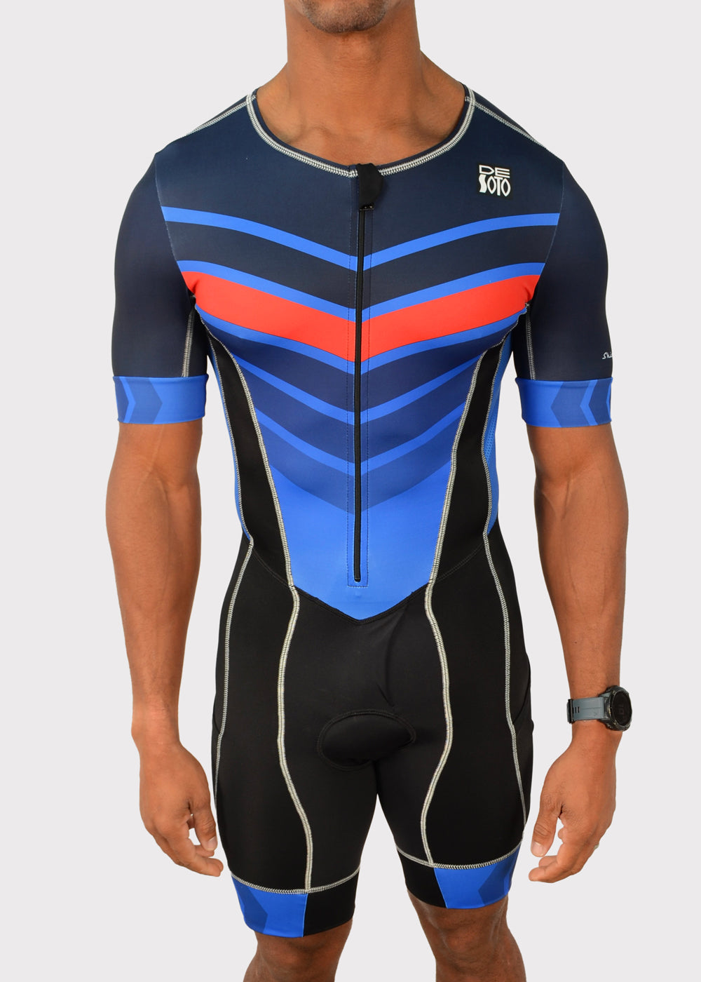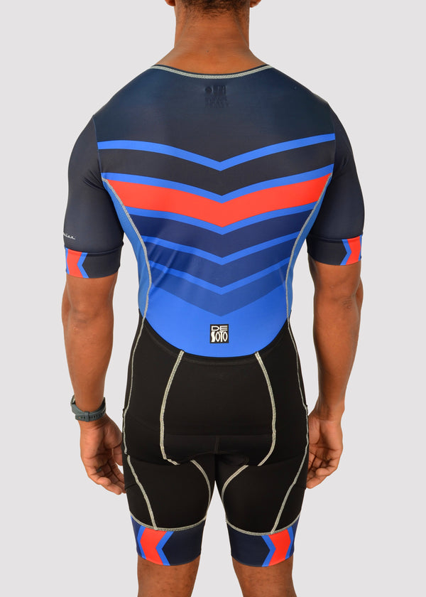 Hinweis zur Passform: Wenn Sie einen langen Oberkörper haben, groß und schlank sind oder für Ihre Körpergröße eher leicht sind und auf der Suche nach einem einteiligen Trisuit sind, ist dies das Richtige für Sie. Bitte gehen Sie nicht von Ihrer Größe aus, sondern nutzen Sie unsere Größentabelle. Im Zweifelsfall senden Sie Fragen per E-Mail an contact@desotosport.com. Triathlon-Bekleidung soll eng an der Haut anliegen. Dadurch sollen mögliche Scheuerstellen und unnötiger Widerstand beim Schwimmen, Radfahren und Laufen vermieden werden. Wenn Ihnen diese Passform nicht gefällt und Sie zwischen zwei Größen liegen, empfehlen wir Ihnen, eine Nummer größer zu wählen. Das Kleidungsstück sitzt beim ersten Anziehen am besten und lockert sich leicht, sobald es nass ist.